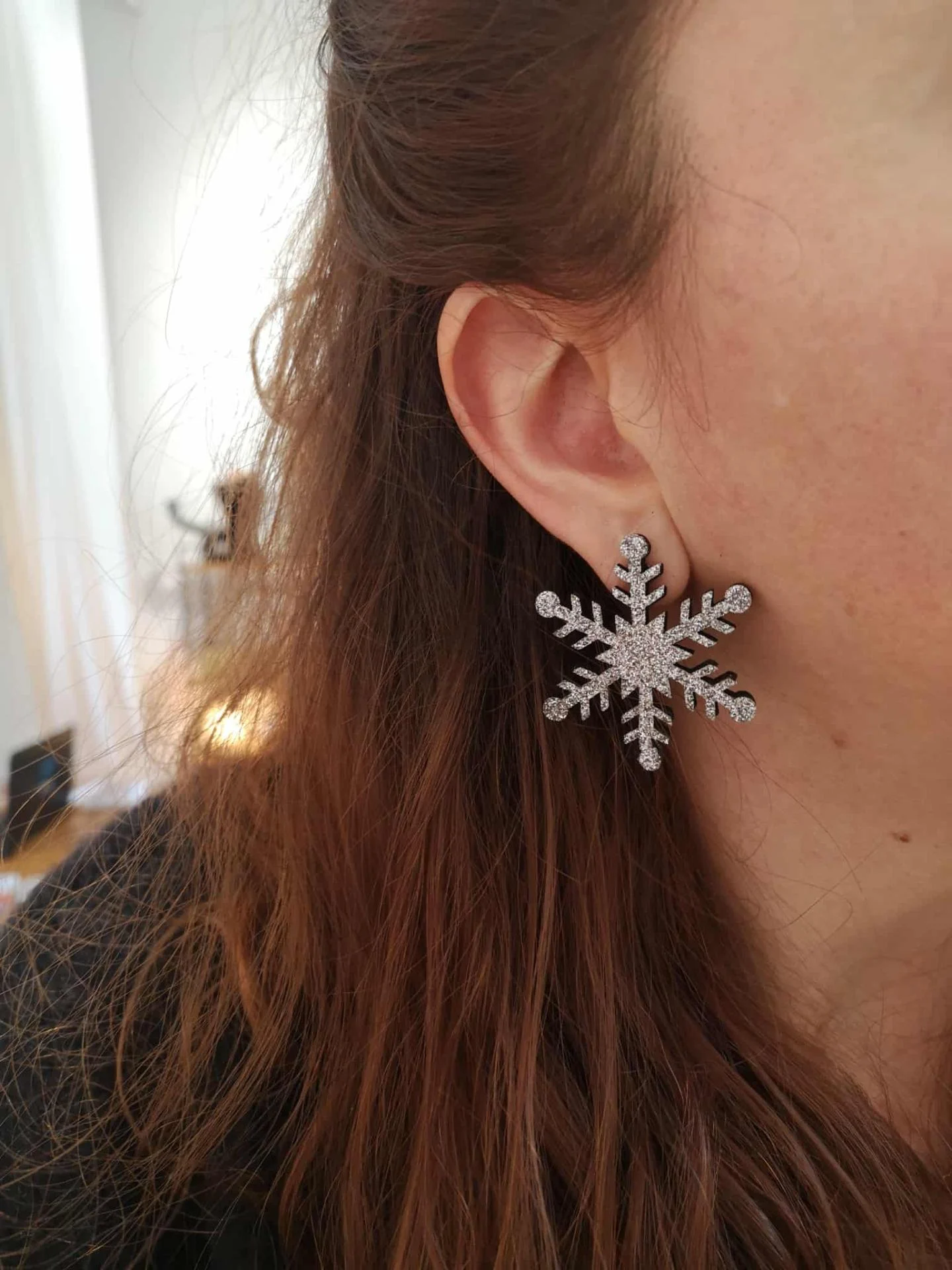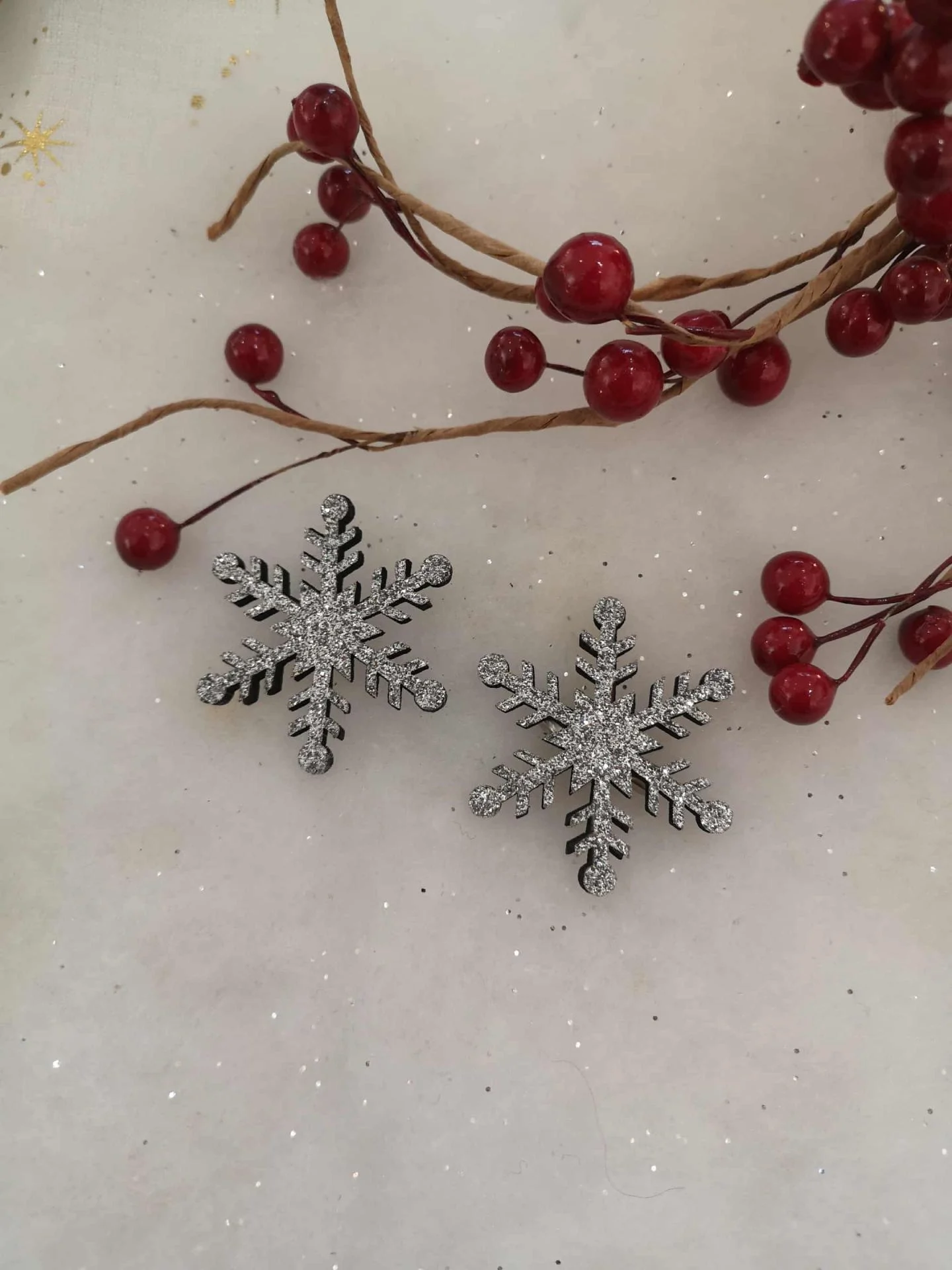 Jolies boucles d'oreilles en bois flocon de neige à paillettes argentées, très chic pour les fêtes de fin d'année !